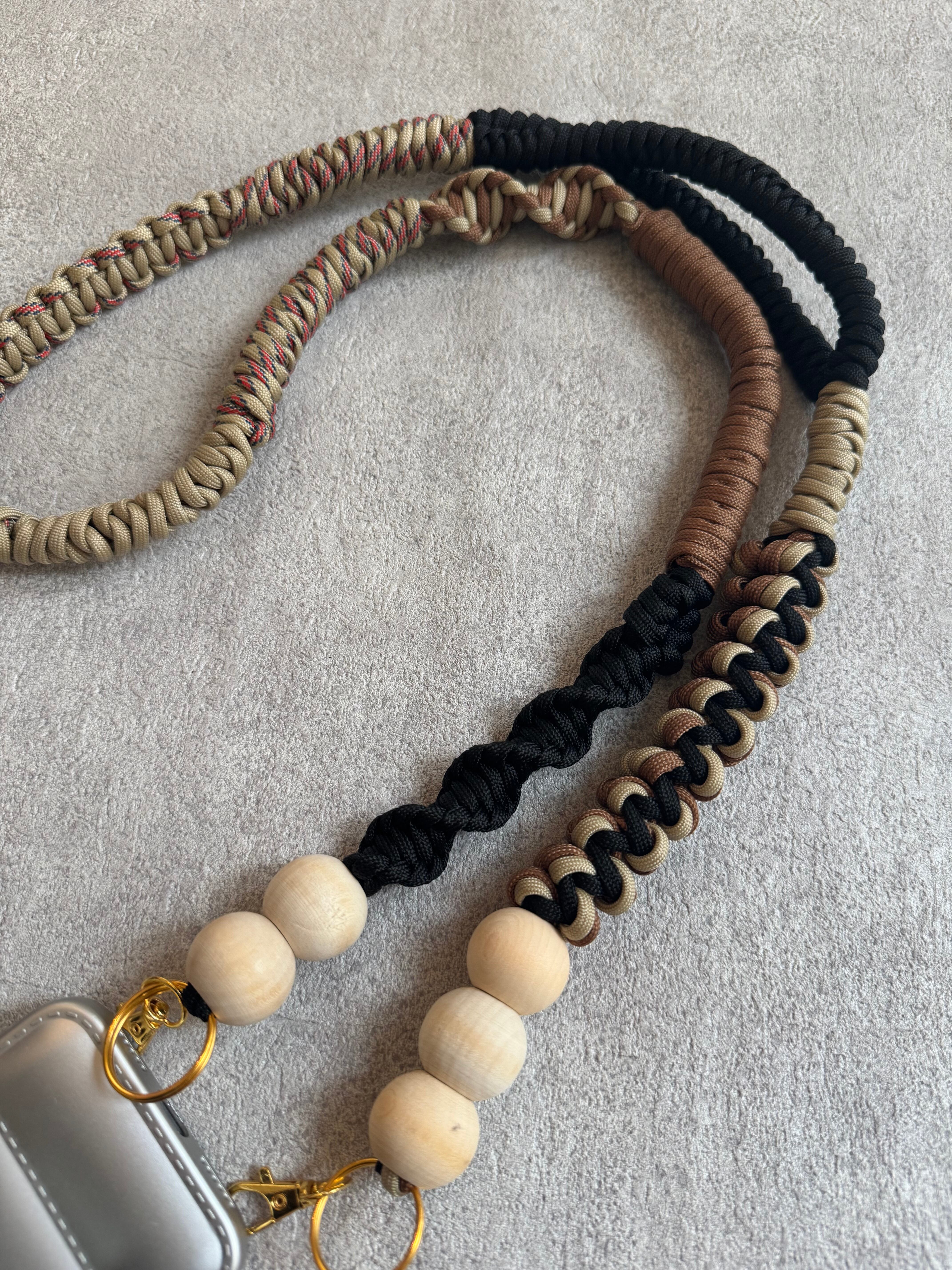 木の風合いとパラコードのカラフルさが調和した、一点もののストラップをお楽しみください。