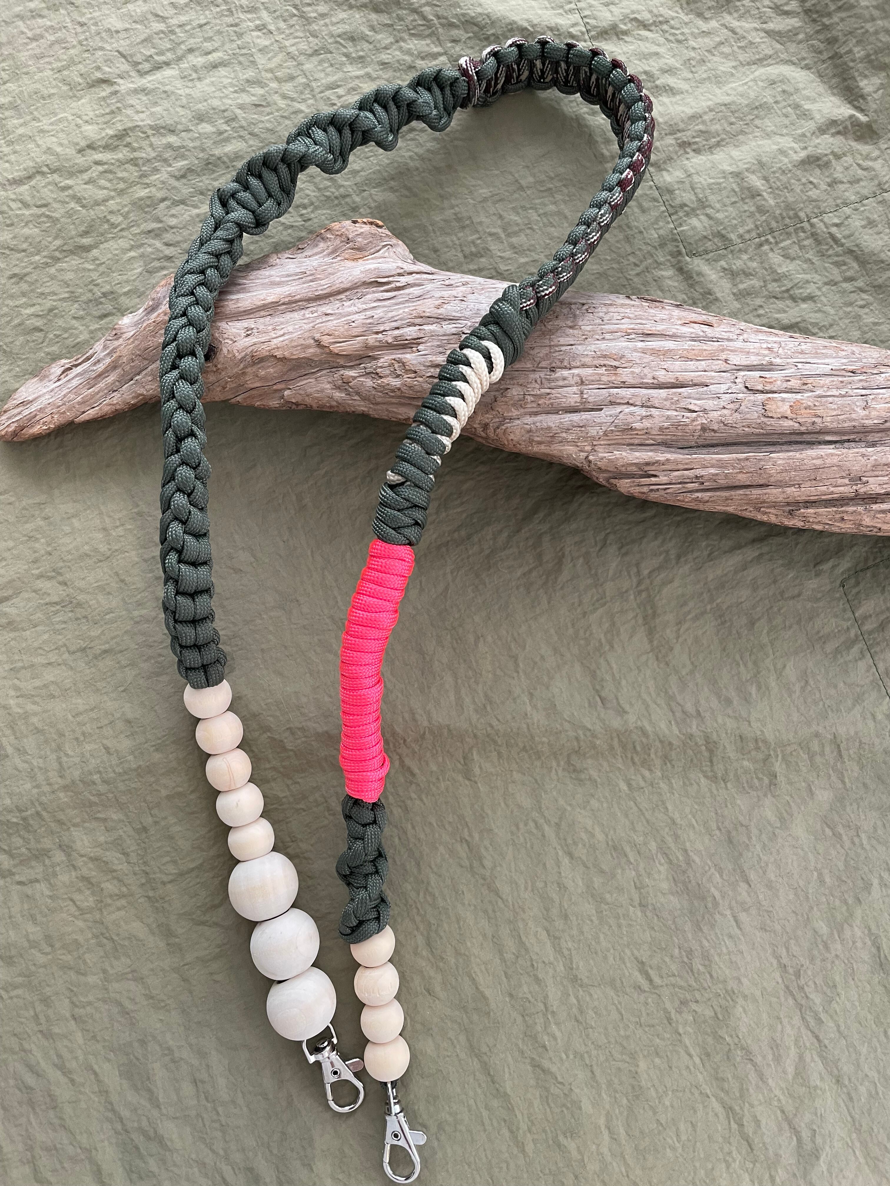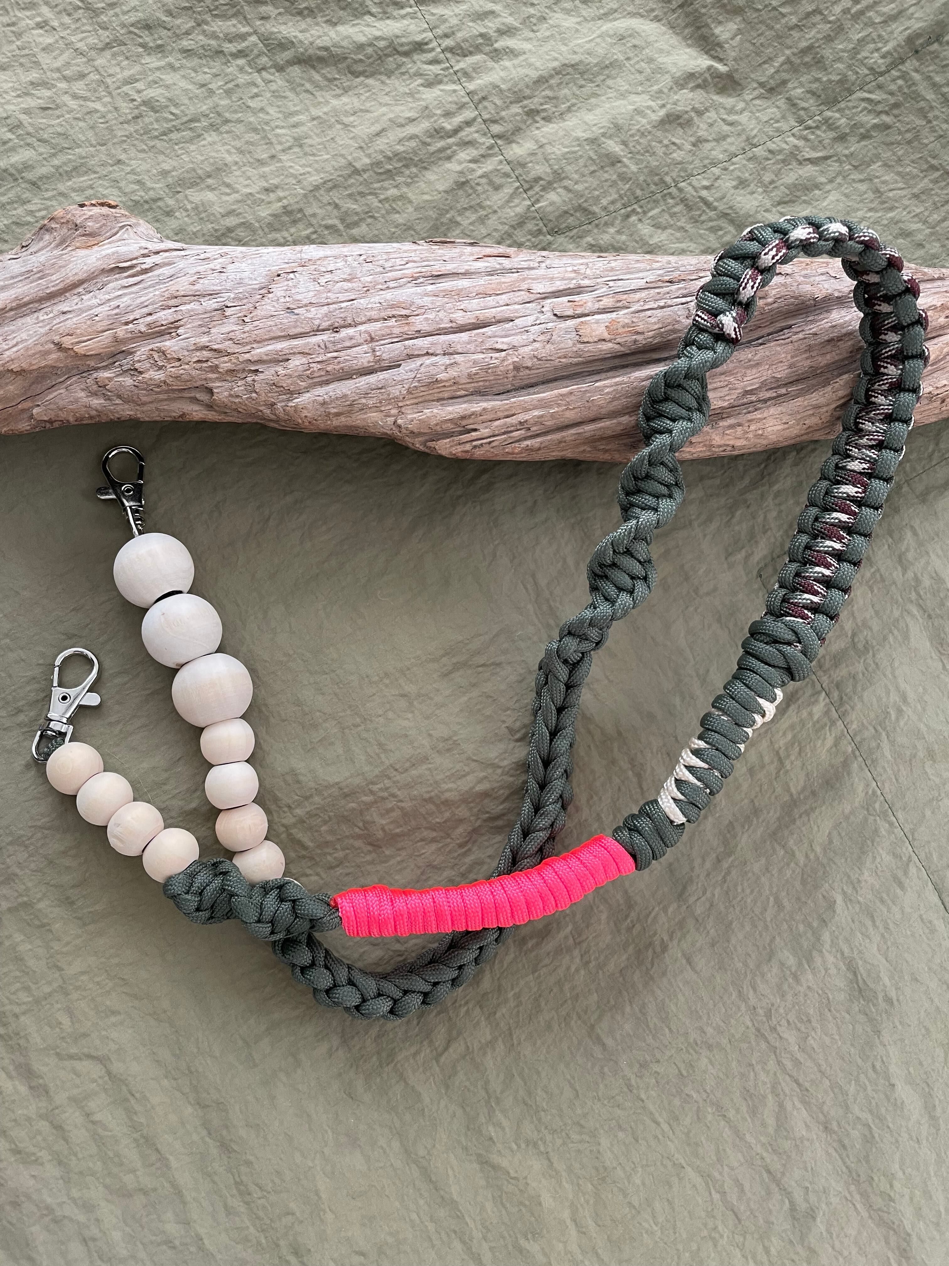 Wood ballとパラコードのストラップ 金具ゴールド khaki×neon pink