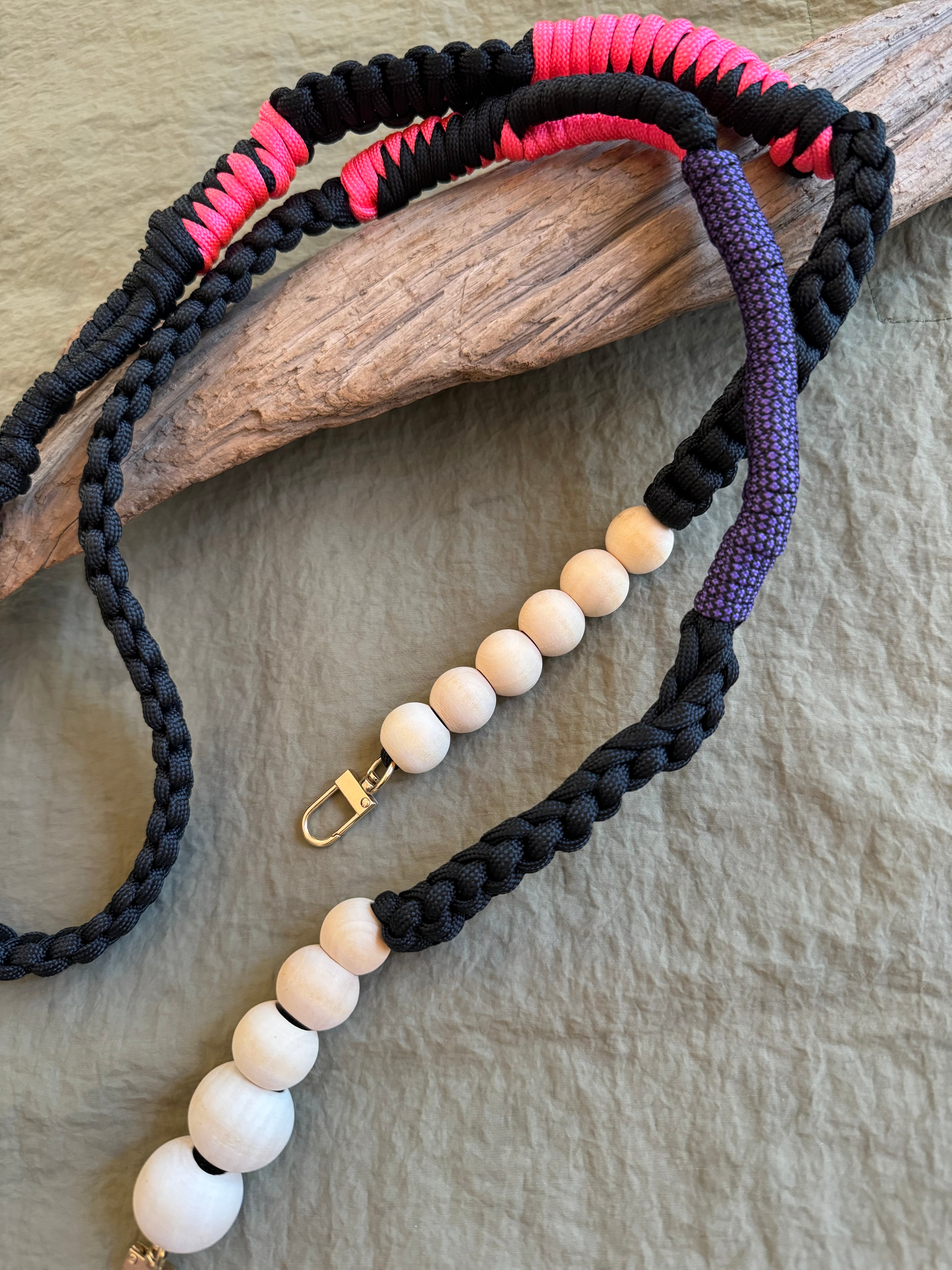 wood ballとパラコードのストラップ Black neon pink ×purple シルバー金具