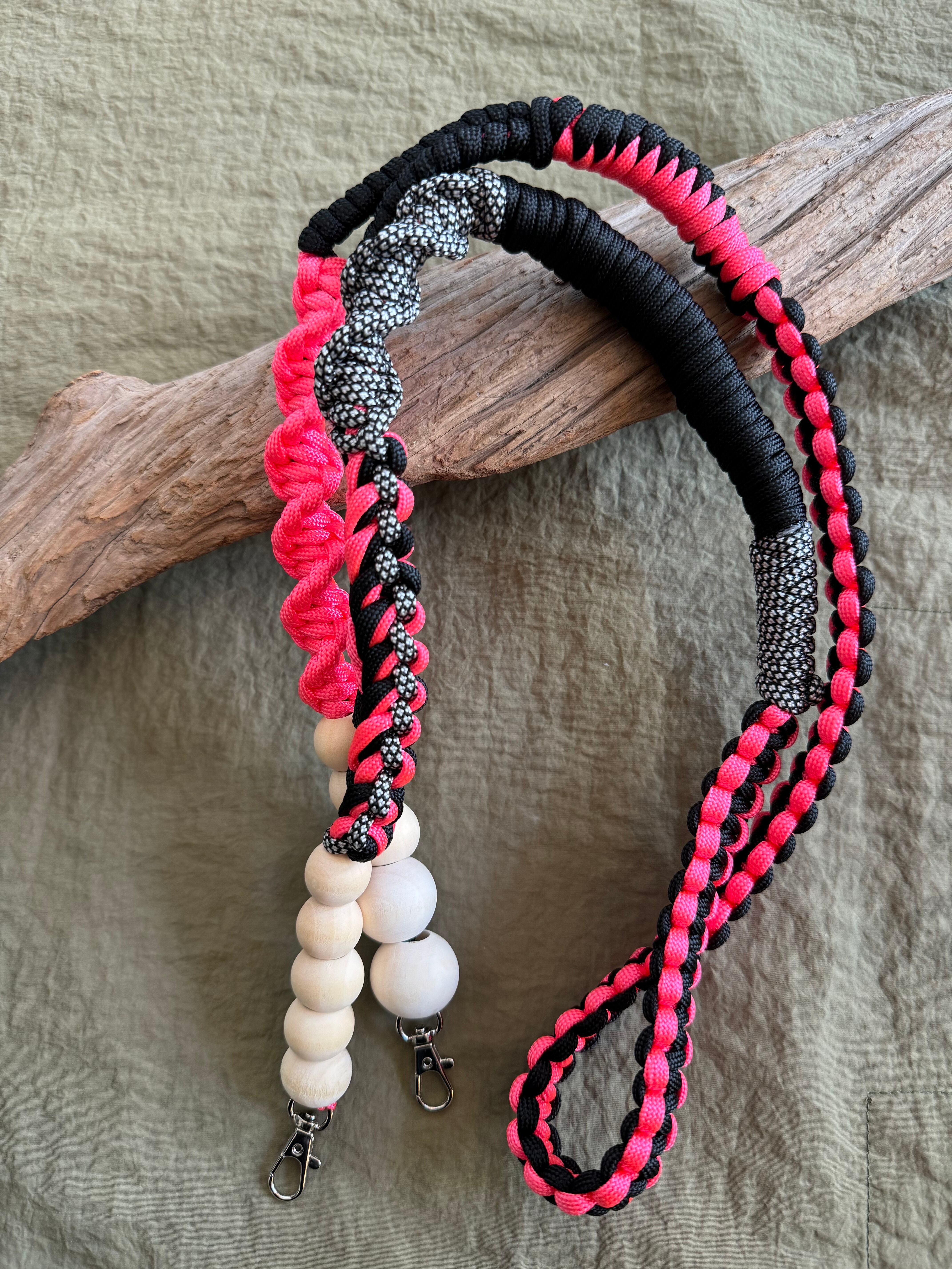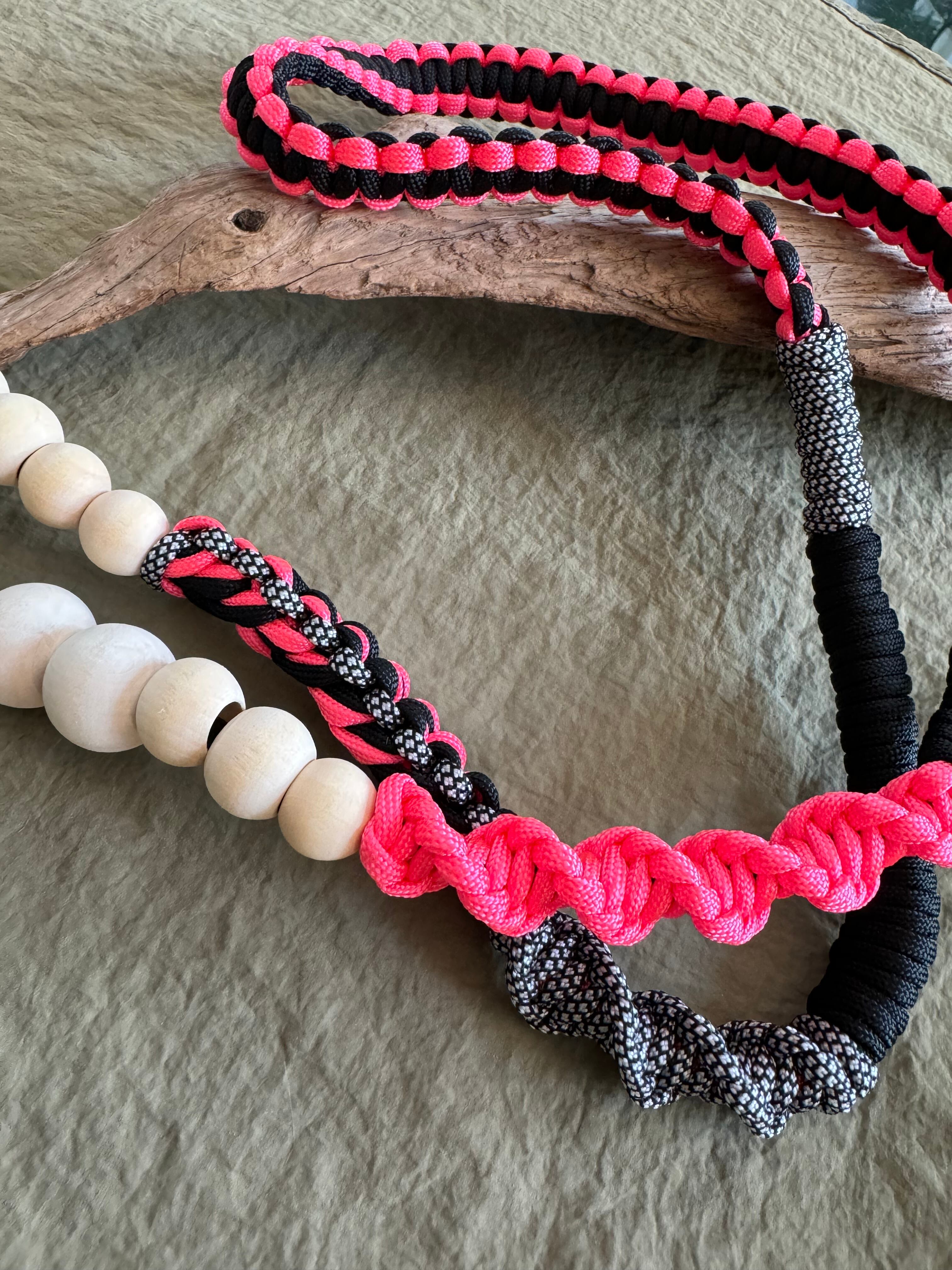 BLACK Wood ballとパラコードのストラップ 金具ゴールド neon pink×monotone